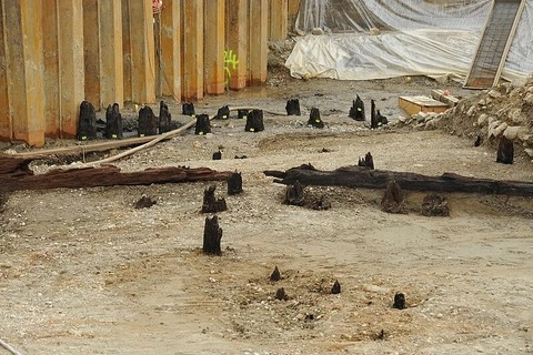 Pfahl-Überresten der Brücke, die damals dort stand, wo sich heute der Kreisel zur Einstellhalle Wydenpark befindet. |