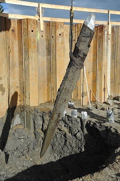 Das Bild zeigt einen langen Holzpfahl, der von einer Baumaschine aus der Erde gezogen wird. |